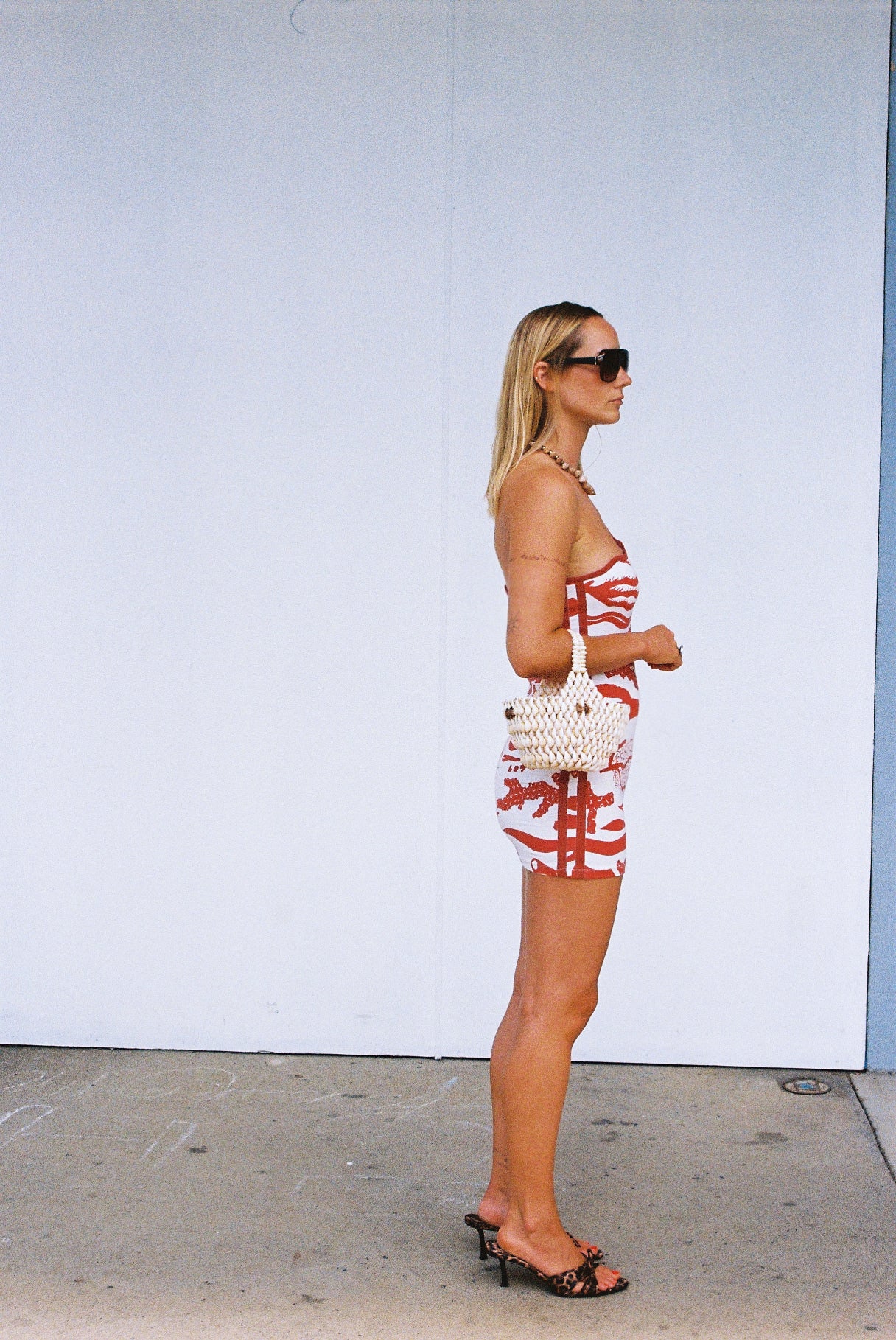 A fitted one shoulder mini dress in luxurious cotton bamboo stretch fabric, featuring a scallop wavey neckline and two strap detail, sports stripe sides and Lotties signature hand drawn coral print