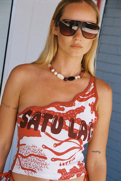 A fitted one shoulder top in luxurious cotton bamboo stretch fabric, featuring a scallop wavey neckline and two strap detail, chest print and Lotties signature hand drawn coral print