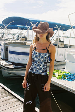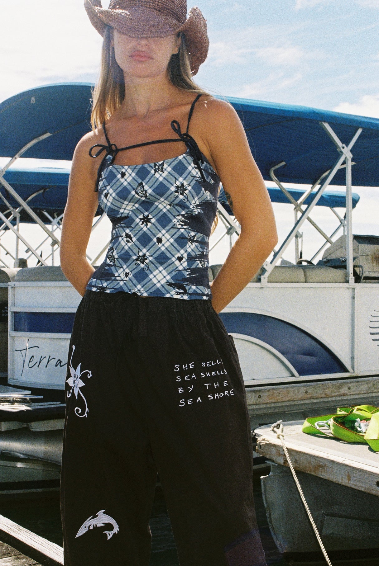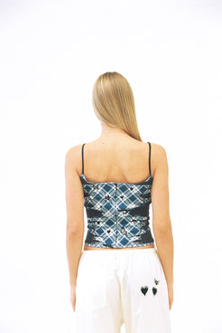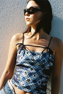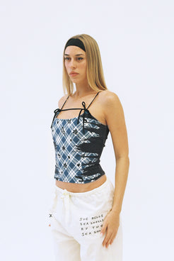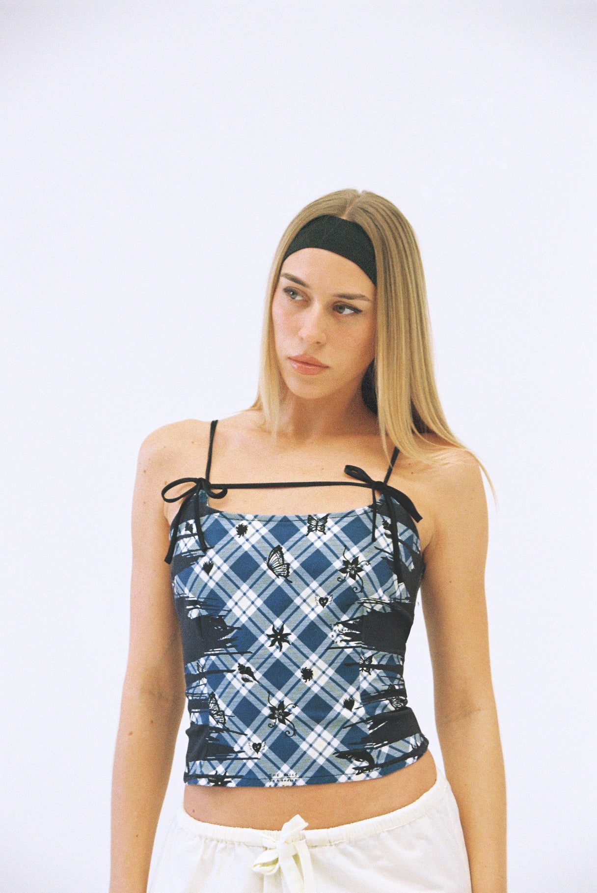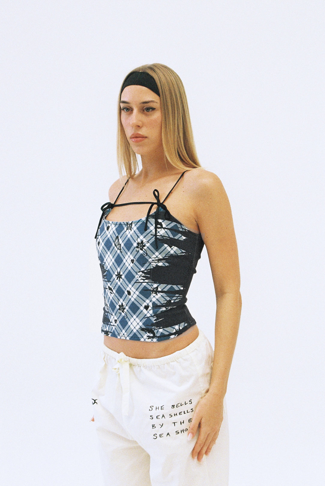 TATTOO BOW TOP. The cutest fitted top, featuring a blue tartan with Lotties tattoo sketches and side tiedye printed panels and silk bow straps