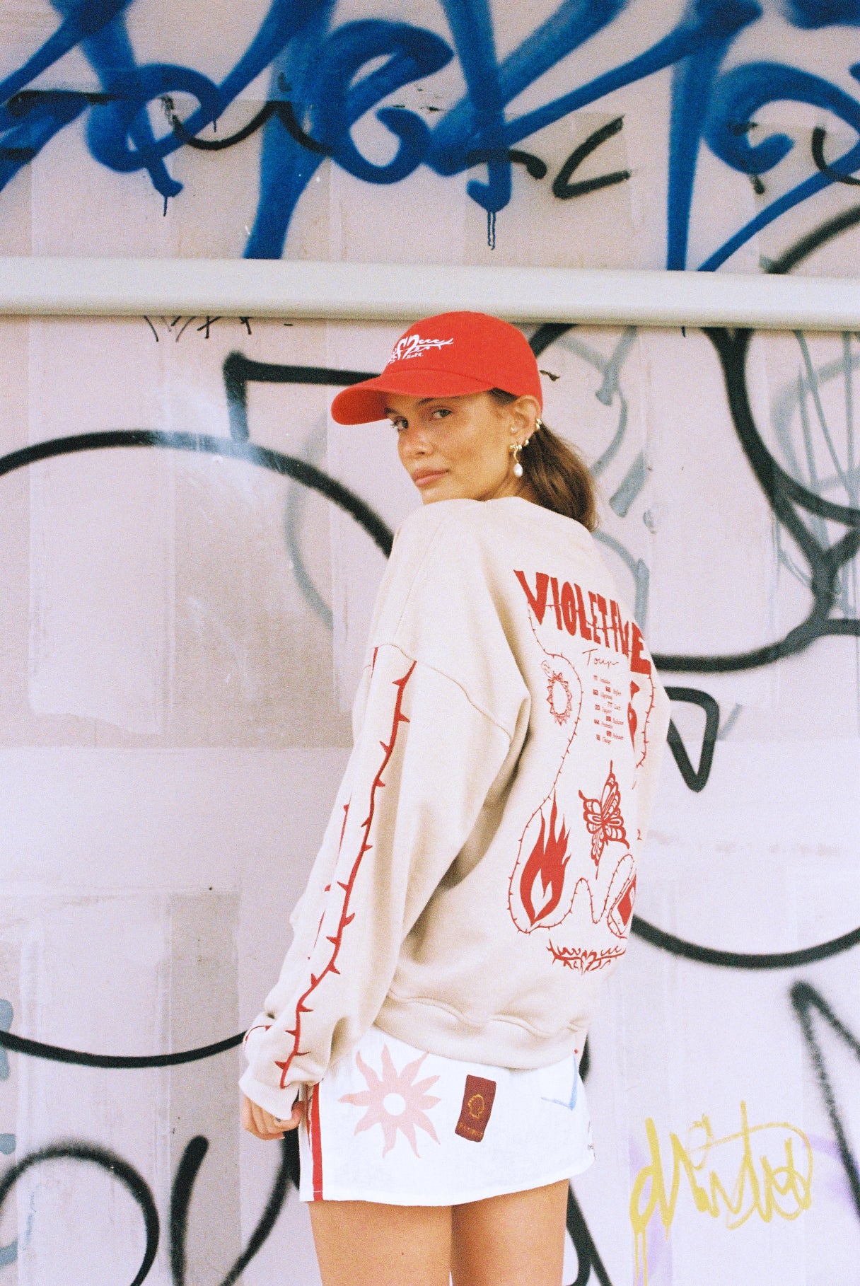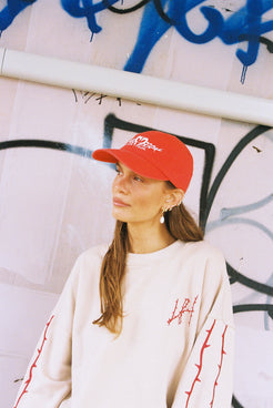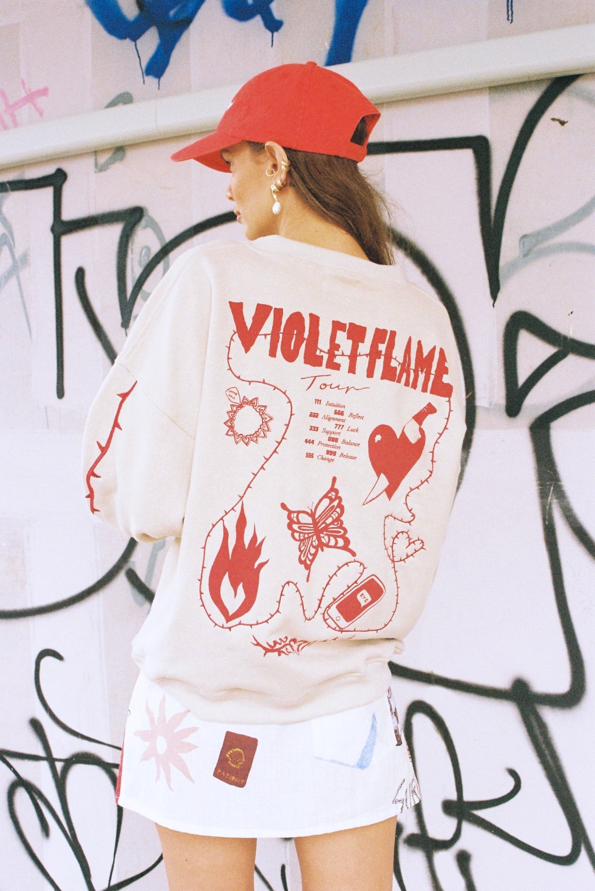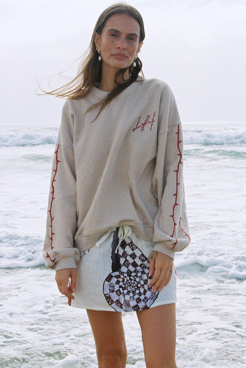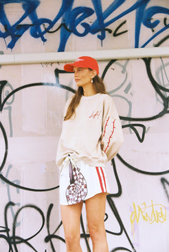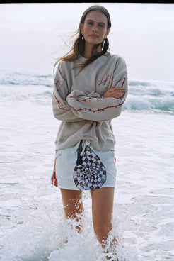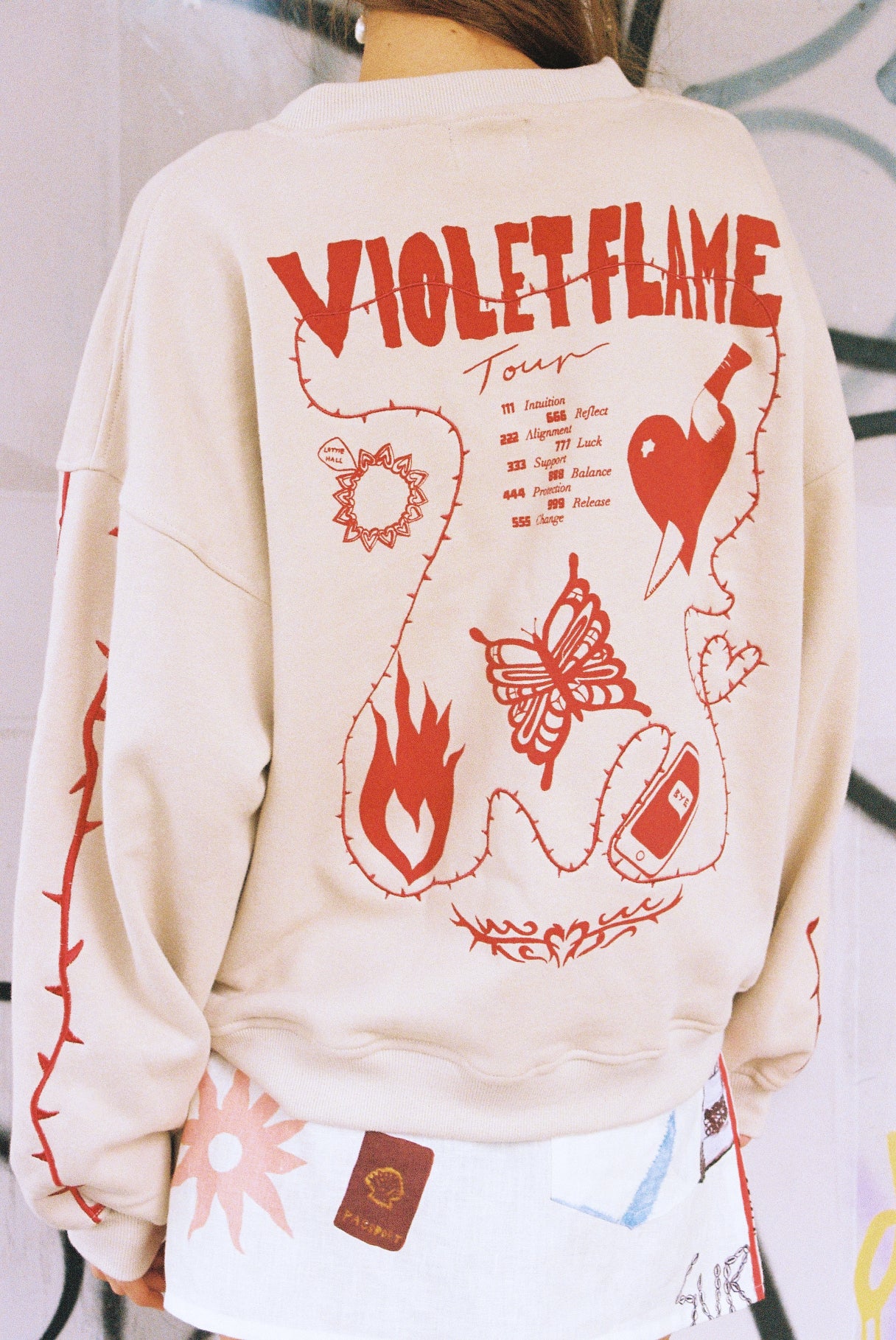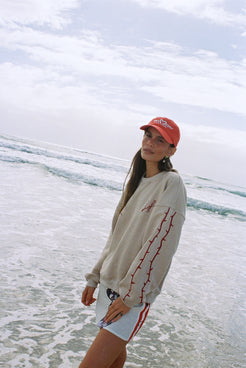 Be comfortable but more importantly be cool. A boxy, slouchy sweater with drop shoulders and embroidery thorn LH on right chest, embroidery thorns two stripe detail on both sleeves and full back print and embroidery detail of tour art by Lottie.